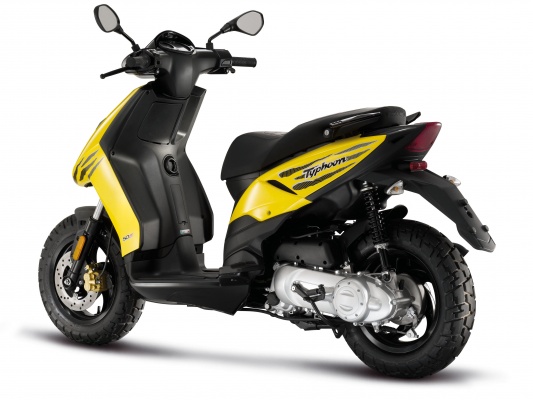 Компания Piaggio представила новый Typhoon 50 по очень соблазнительной цене – всего 1400 евро или 1850 долларов США. Новинка интересна внешне и показывает прекрасные результаты по динамике и скорости, благодаря обновленному двигателю. Двигатель теперь четырехтактный, четырехклапанный, объемом 49 см3. Охлаждение – воздушное. Также новинка оборудована 14 дюймовыми колесами и большим баком. Новый двигатель способен раскрутиться до 9500 оборотов, выдавая при этом 4,5 л.с. мощности. Максимальный крутящий момент достигается при 8000 оборотах. При этом максимальная скорость составляет скромный по итальянским меркам 65 км/ч.